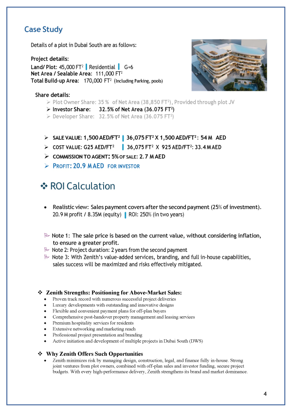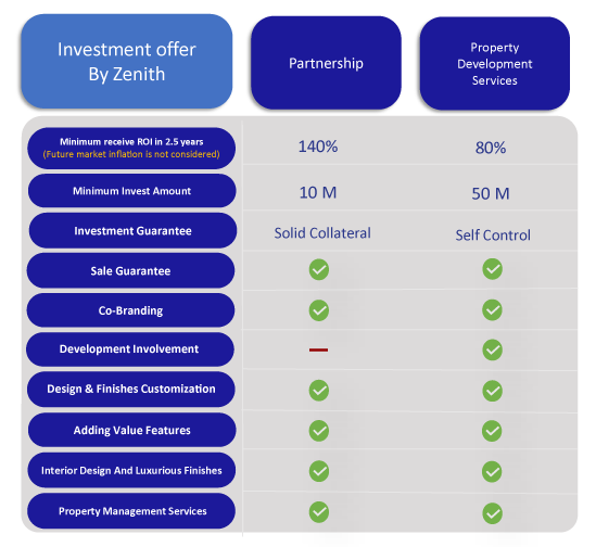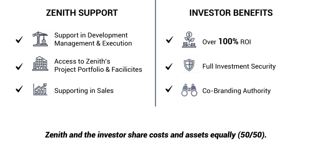 In a partnership model, the investor is generally responsible for their share of the plot value and initial related expenses. However, Zenith leverages its credit to offer a flexible payment plan, while allocating a defined percentage of project ownership to the investor.