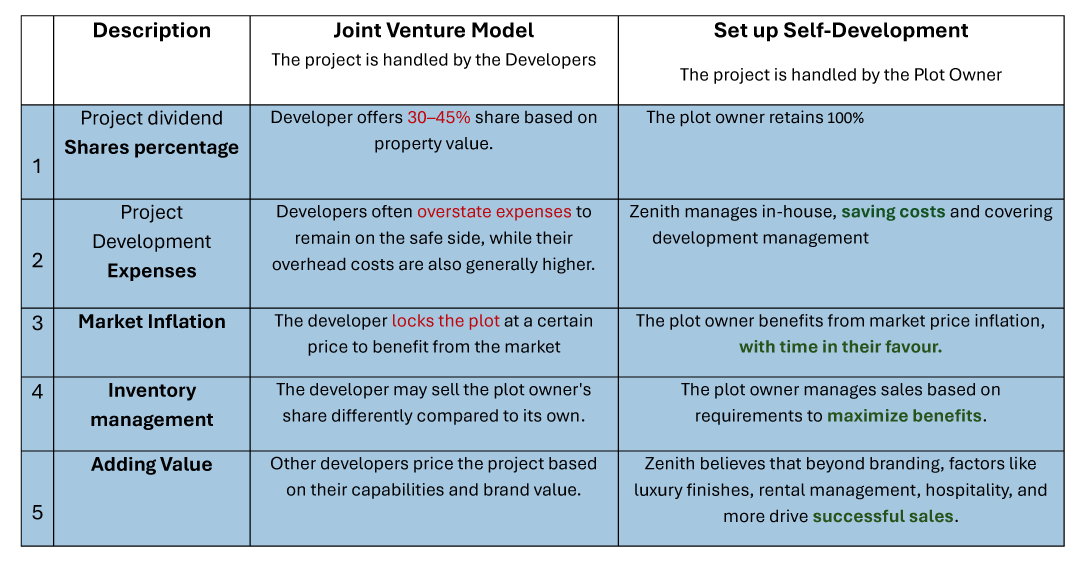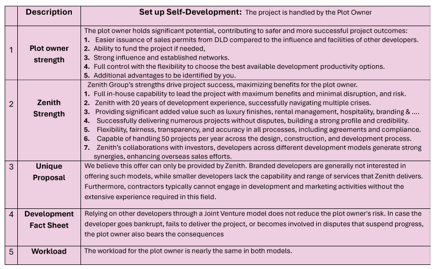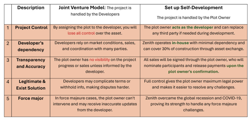Zenith proposes to such investors a comprehensive development service, extending its brand credibility, provided the investor agrees to the following services and fees. This structure enables Zenith to secure the project and effectively mitigate associated risks.