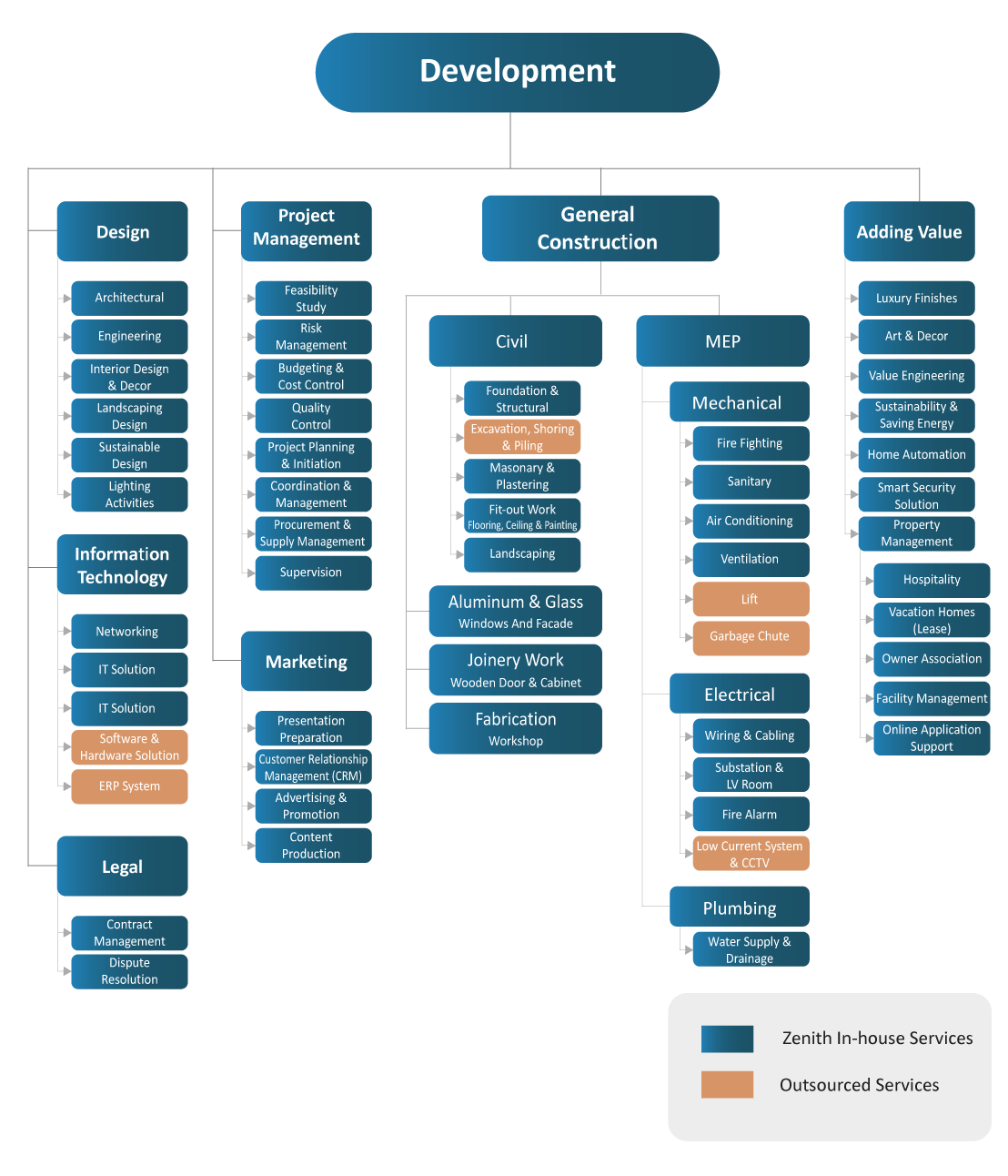 In such cases, Zenith will charge a 3% project management fee for each specific service outsourced. This fee covers Zenith’s role in supervising the external service providers to ensure that the quality, standards, and branding associated with Zenith are upheld, while also safeguarding the interests of the strategic partner throughout the development process.